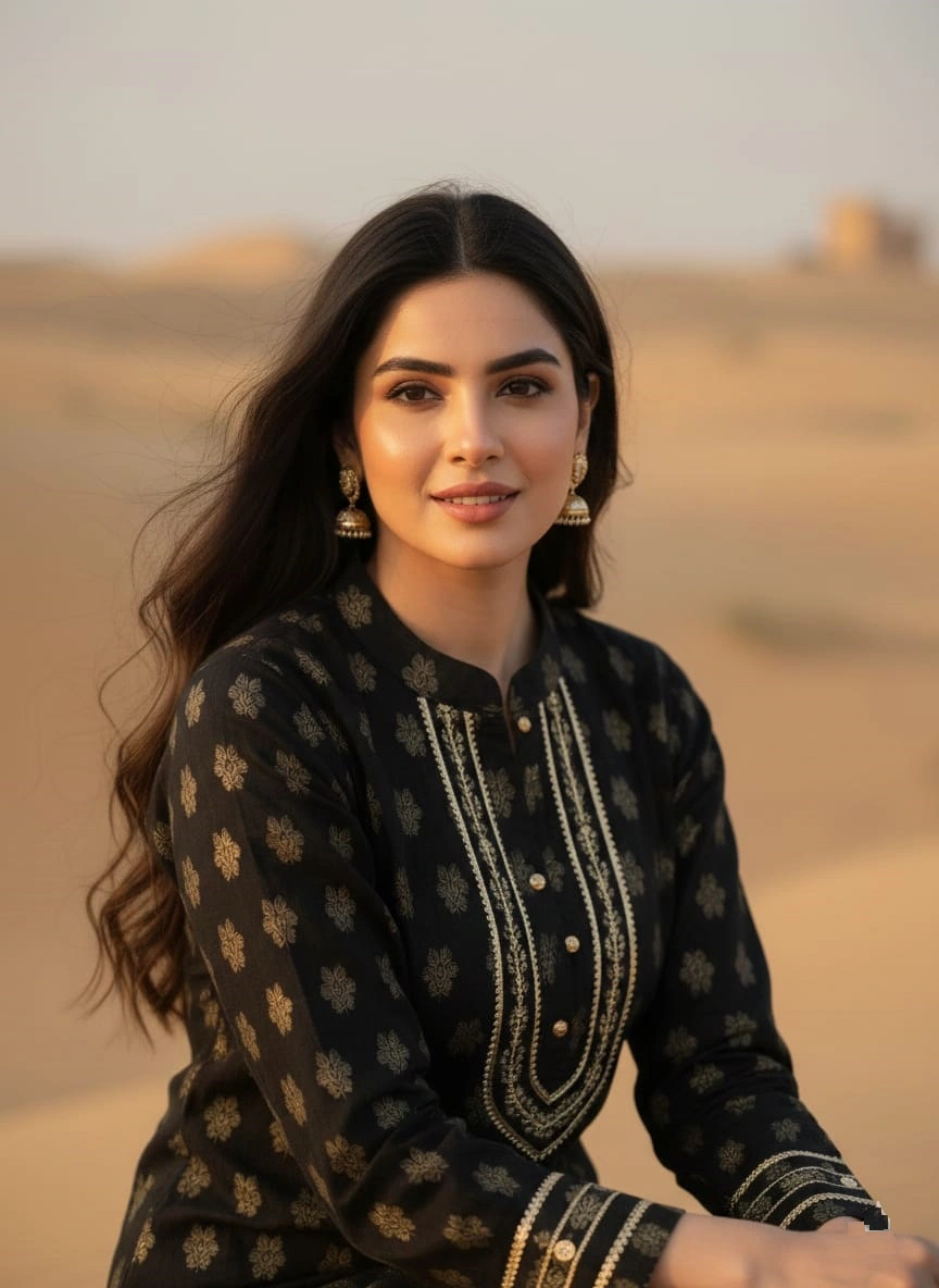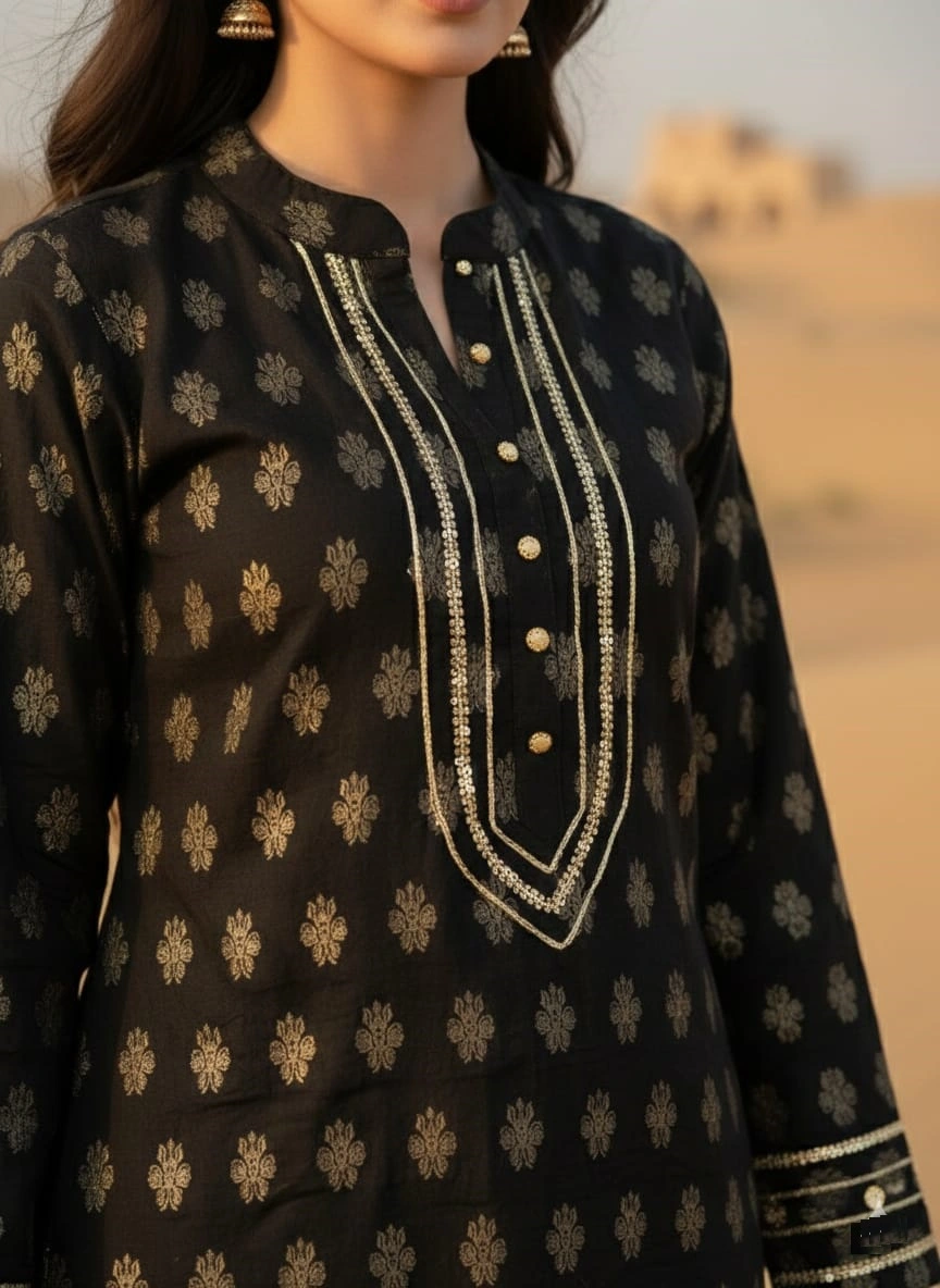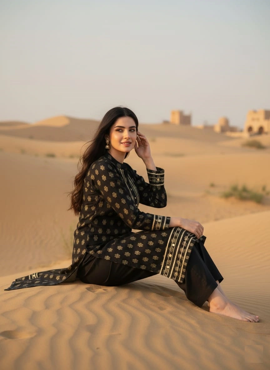 As we move through 2026, the trend of “Muted Opulence” takes center stage. This outfit speaks to that aesthetic, featuring a sophisticated interplay of matte black and shimmering gold weave. The bodice is adorned with delicate gold lace-work and mirror-finish accents that frame the neckline with a royal touch. Whether you’re heading to a morning lecture or a festive dinner, the lightweight nature of the Jacquard Lawn ensures you stay cool while looking impeccably polished. It’s the ultimate investment piece for those who value refined silhouettes and timeless designer quality.