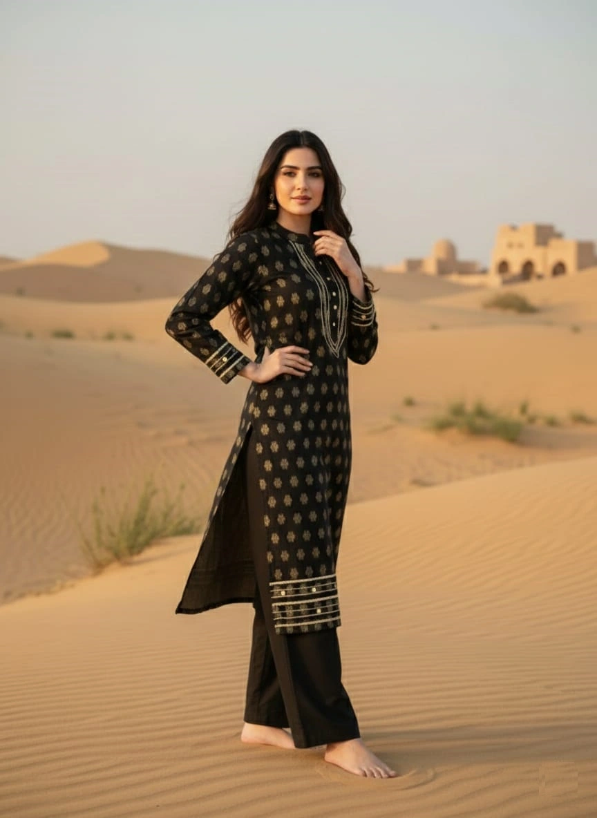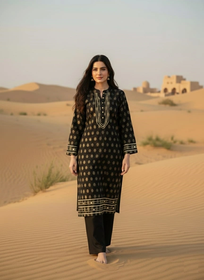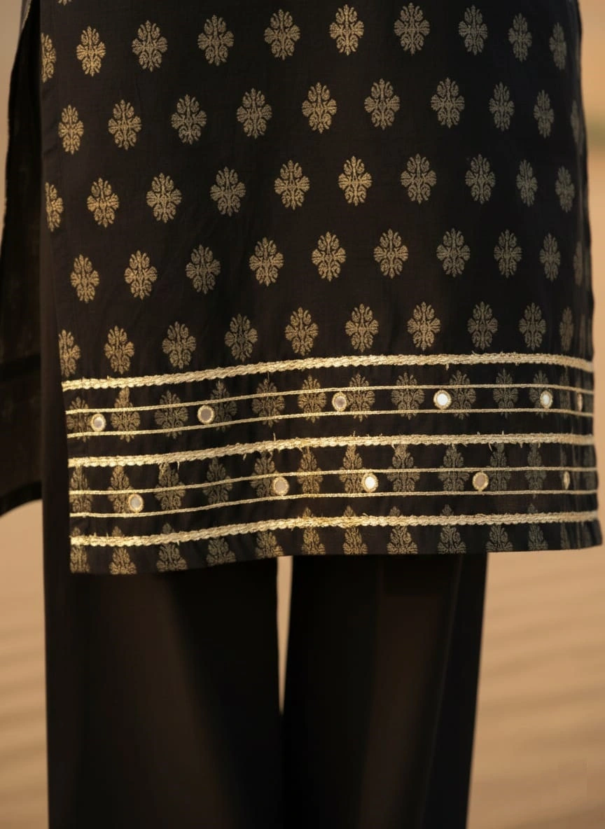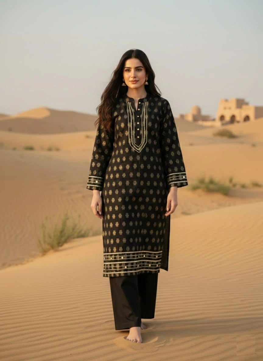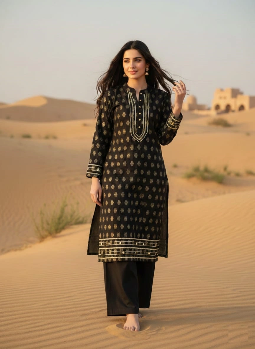 Embrace the Quiet Luxury movement with our signature Black Jacquard Lawn ensemble. This isn’t just a suit; it is a fusion of Sustainable Heritage and Minimalist Couture. The deep ebony fabric is woven with intricate gold-toned motifs, utilizing premium Jacquard Lawn to ensure a breathable yet rich texture that holds its shape beautifully in any season.