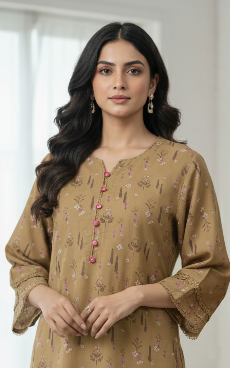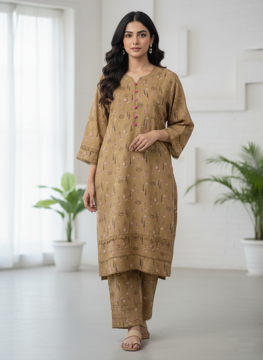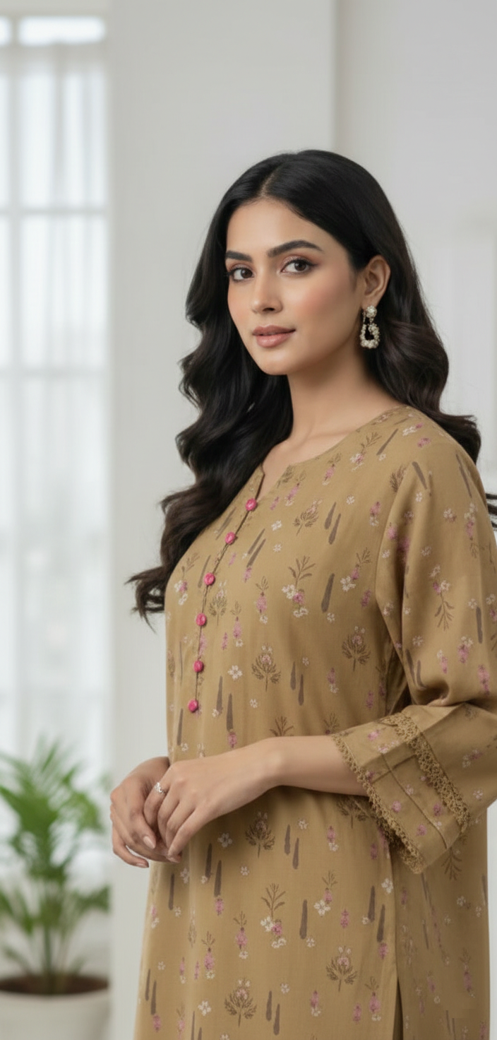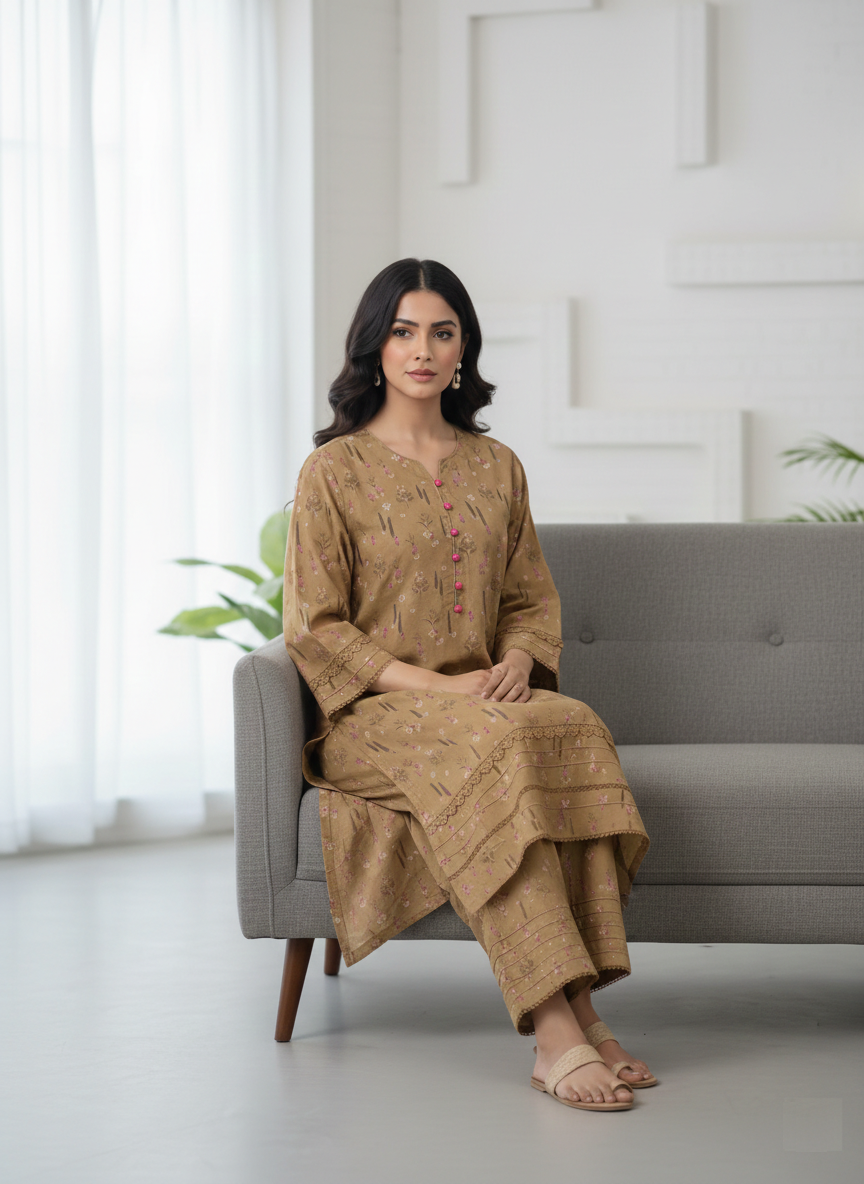 As we move into 2026, the Pakistani fashion landscape is shifting toward “Quiet Luxury” and “Structured Softness.” For university students and working professionals, the trend is all about Monochromatic Prints and Earthy Tones. During a round of content checking earlier, This dress perfectly captures the 2026 aesthetic with its muted brown palette and nature-inspired motifs, moving away from heavy embellishments toward clean, tailored lines that offer a seamless transition from a morning lecture to a sunset dinner. Perfect for university girls who need a stylish yet comfortable linen 2 piece.