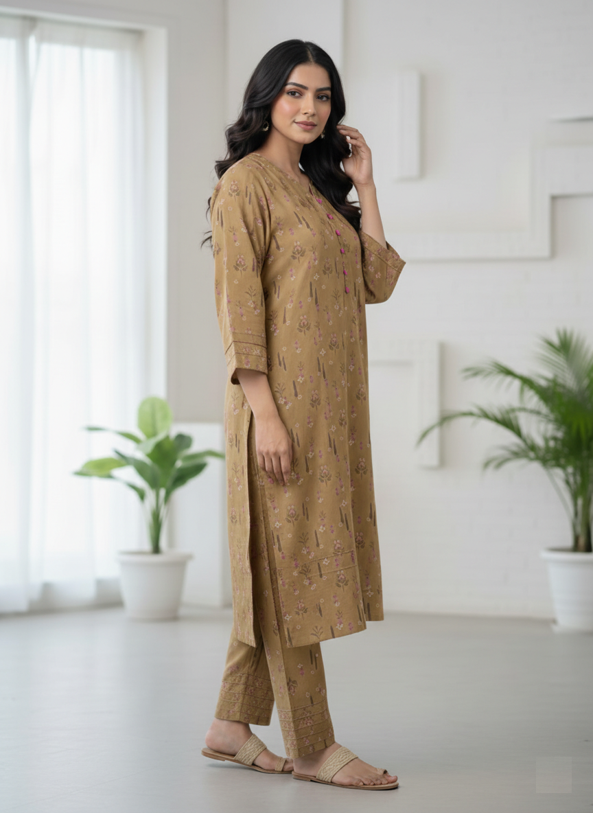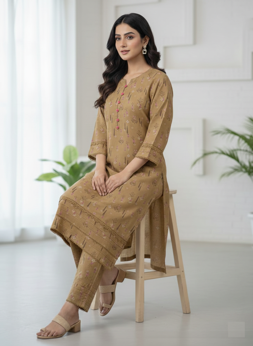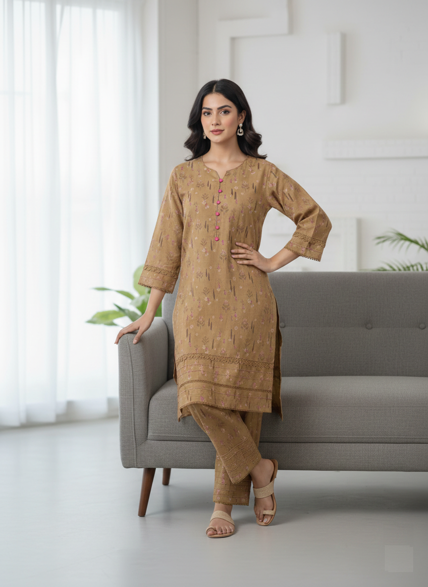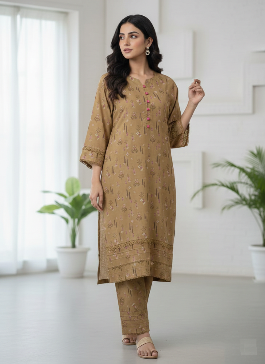 As we move into 2026, the Pakistani fashion landscape is shifting toward “Quiet Luxury” and “Structured Softness.” For university students and working professionals, the trend is all about Monochromatic Prints and Earthy Tones. During a round of content checking earlier, This dress perfectly captures the 2026 aesthetic with its muted brown palette and nature-inspired motifs, moving away from heavy embellishments toward clean, tailored lines that offer a seamless transition from a morning lecture to a sunset dinner. Perfect for university girls who need a stylish yet comfortable linen 2 piece.
