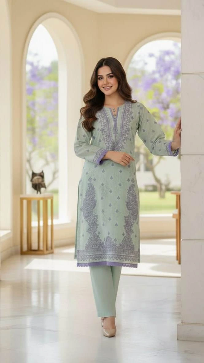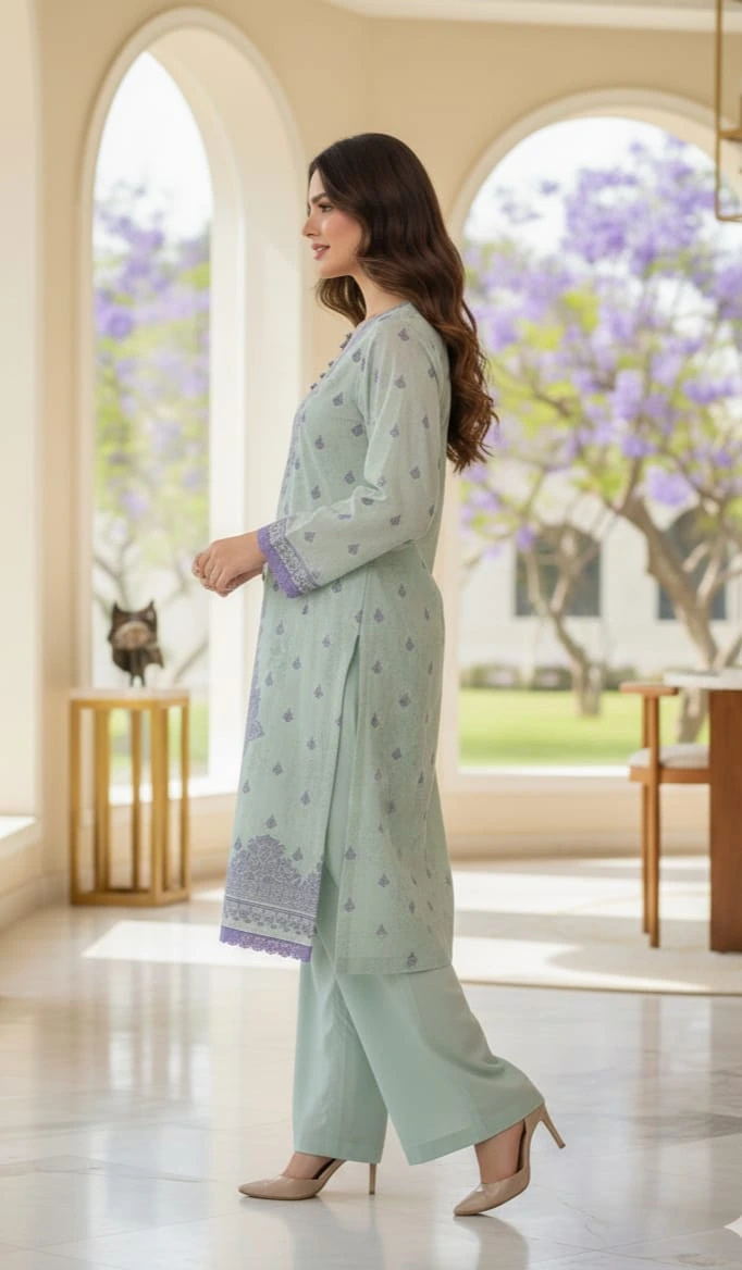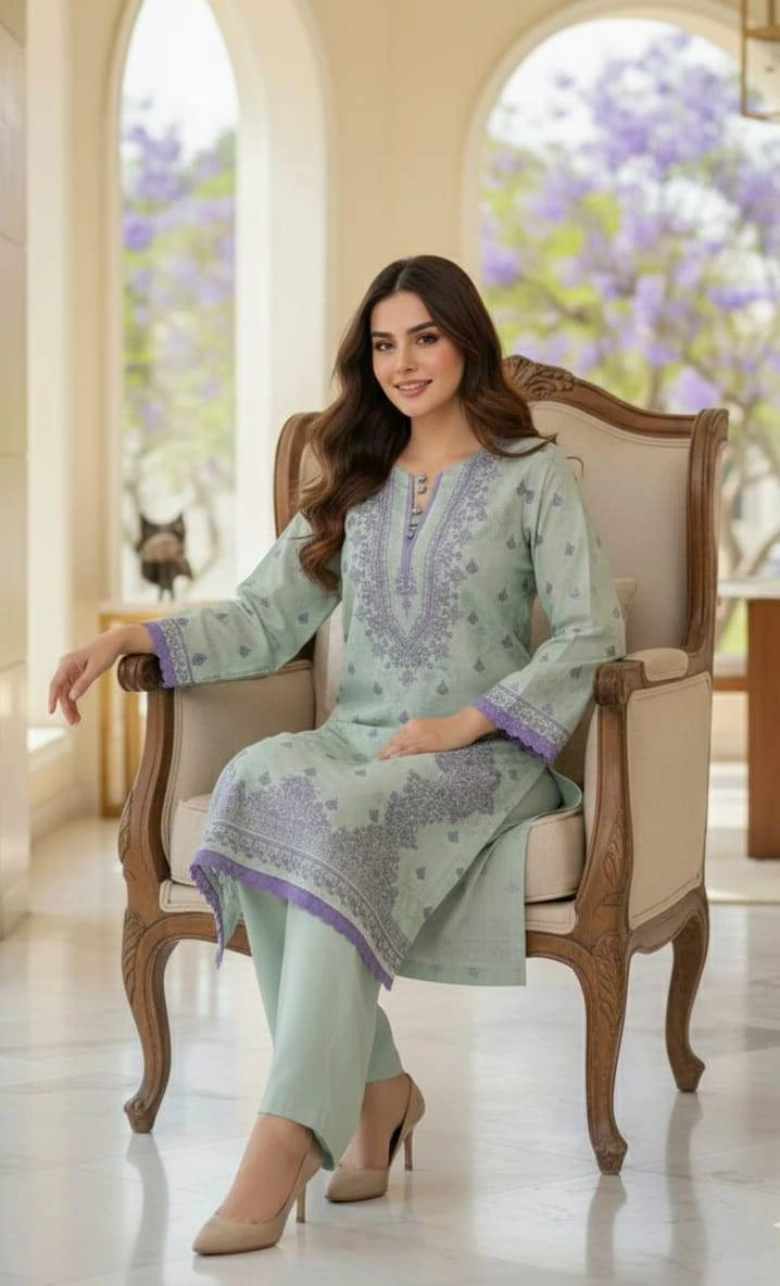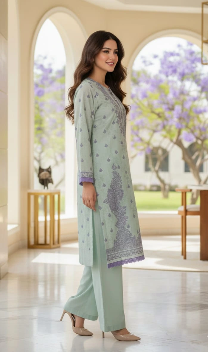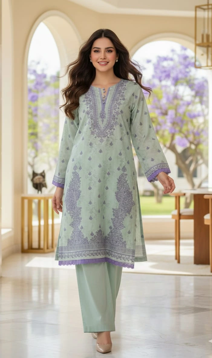 Embrace the 2026 trend of “Quiet Luxury” with this exquisitely crafted 2-piece Lawn ensemble. Featuring a refreshing Seafoam Green base contrasted with delicate Lace work, this outfit perfectly captures the season’s move toward muted tones and refined silhouettes.